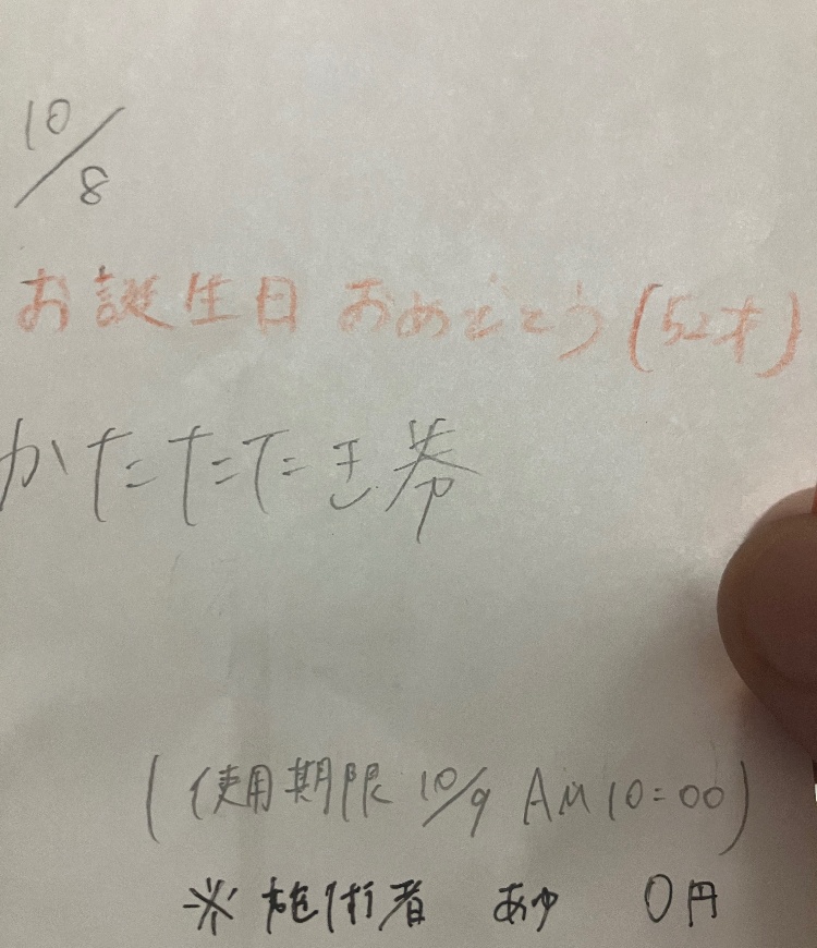 おうちに帰ると、娘から、かたたたき券をプレゼントされまして。今朝2回、無料で施術してくださいました。