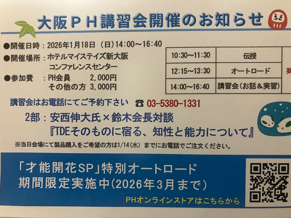 1/17(土)14:00〜は、大阪市の福島で、TDEエネルギーの、遊びの会をします。参加希望の方は、LINEかメールで。1/18(日)14:00〜は、新大阪で、TDEエネルギーの、大阪講習会あります。参加希望の方は、お電話で。https://www.perfect-harmony.blog/koushuukai20260118/tel.03-5380-1331